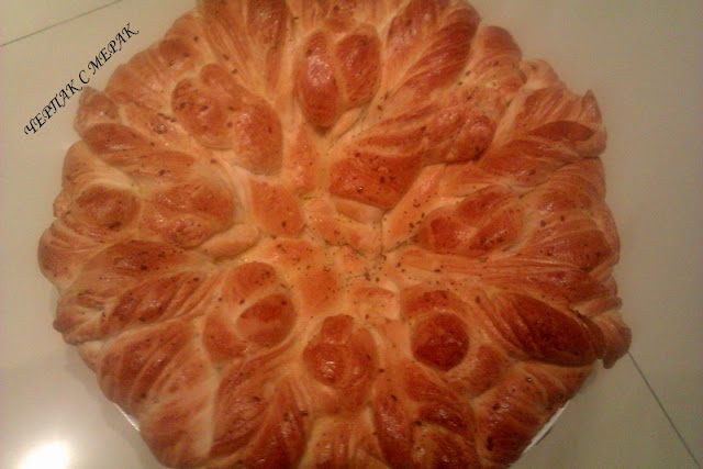 Затоплих прясното мляко и разтворих в него маята ,ако е суха няма нужда, а направо в брашното. Всички продукти се изсипват в кладенчето и се омесва средно меко тесто.