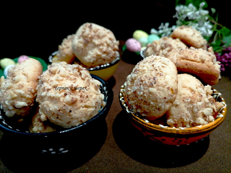С намазнени ръце оформяте топчета, които топите в счуканите орехи .